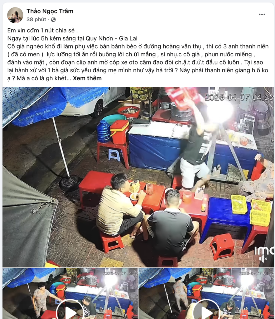 Cô già nghèo khổ đi làm phụ việc bán bánh bèo ở đường hoàng văn thụ , thì có 3 anh thanh niên ( đã có men ) lực lưỡng tới ăn rồi buông lời ch.ữi mắng , sỉ nhụ.c cô già , phun nước miếng , đánh vào mặt , còn đoạn clip anh mở cóp xe oto cầm đao đòi ch.ặ.t đ.ứ.t đầ.u cô luôn . Tại sao lại hành xử với 1 bà già sức yếu đáng mẹ mình như vậy hả trời ? Này phải thanh niên giang h.ồ ko ạ ? Mà a có là gh khét tiếng này kia cũng v , k ai gh mà đi hành xử như vậy hết .